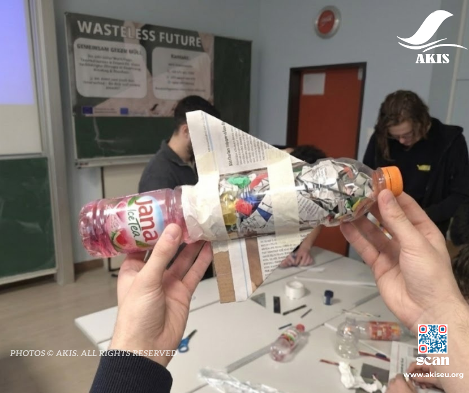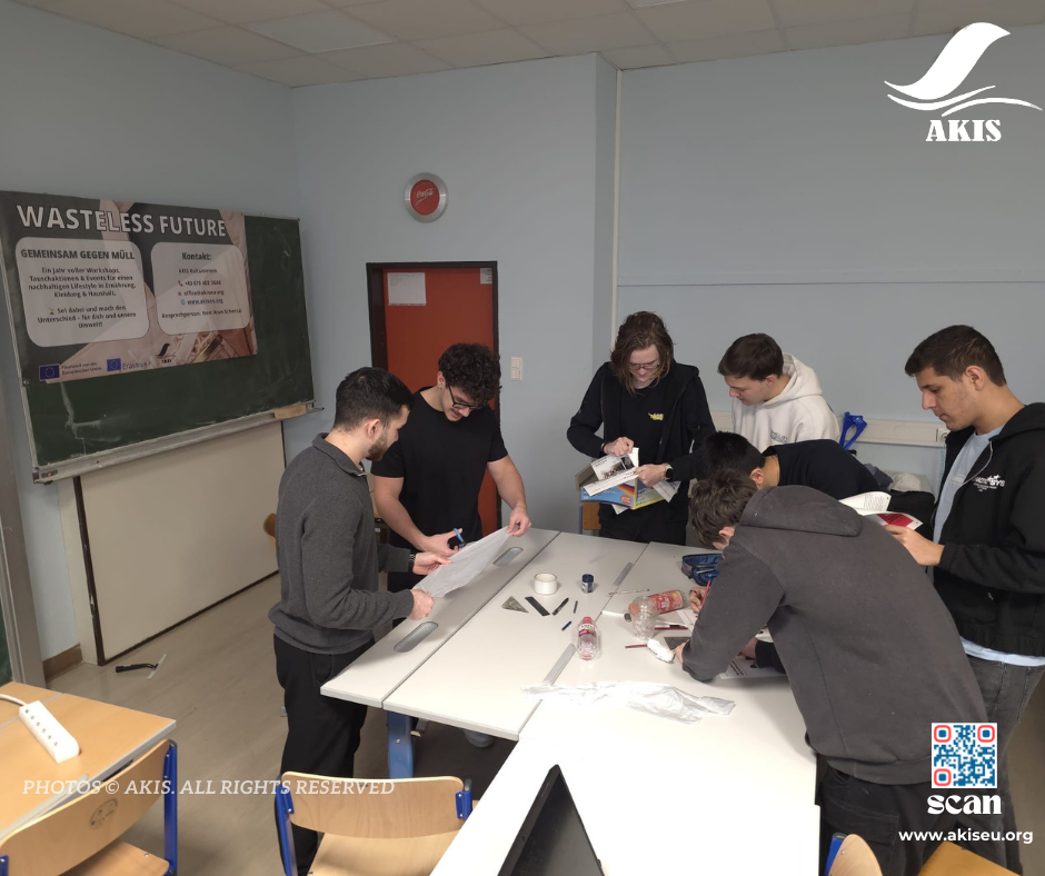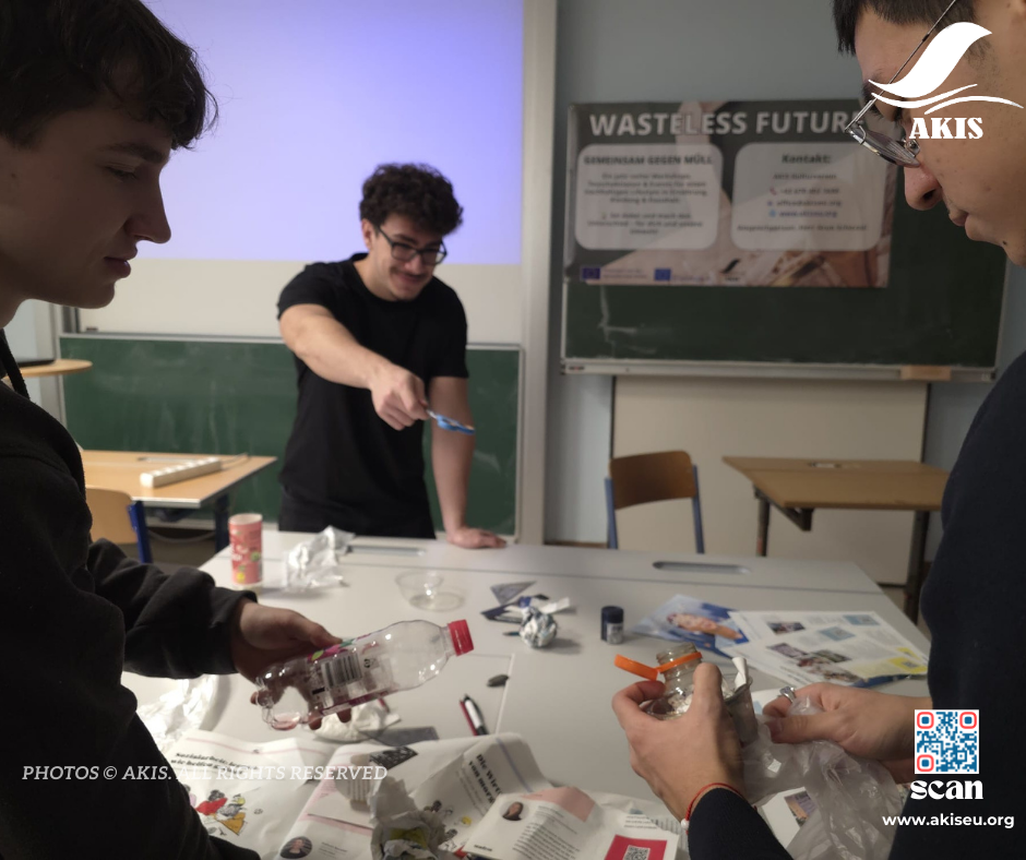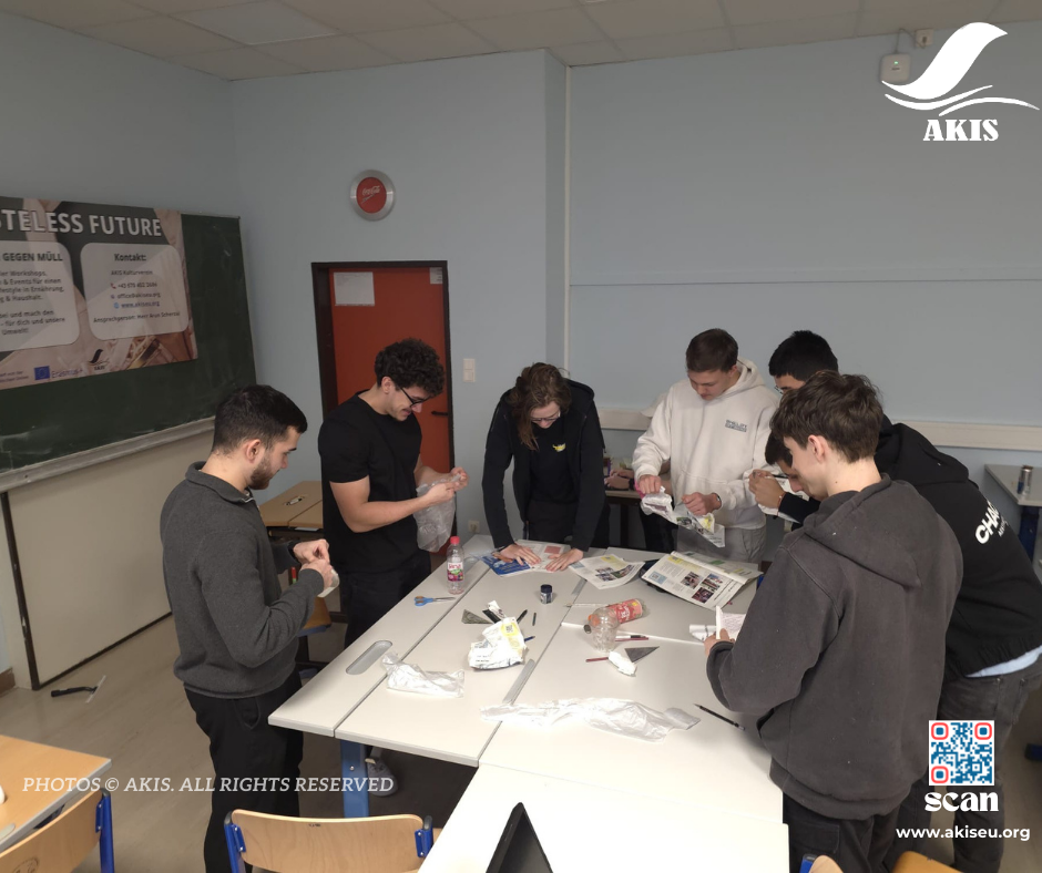 Der Workshop: „Trash to Art“ 📍 Gruppenraum / Schule Im Mittelpunkt stand die Frage: Ist das Müll oder Baumaterial? Statt teurem Bastelbedarf lagen leere PET-Flaschen, alte Magazine, Plastiktüten und Kartonreste auf den Tischen bereit. Die Teilnehmer hatten die Aufgabe, diesen „Abfall“ in etwas Neues zu verwandeln. Mit Schere, Tape und viel Fantasie entstanden in kürzester Zeit spannende Konstruktionen. Besonders kreativ wurde mit den verschiedenen Materialien experimentiert: Plastikflaschen dienten als Basis für Skulpturen, zerschnittene Magazine sorgten für Farbe und Struktur.