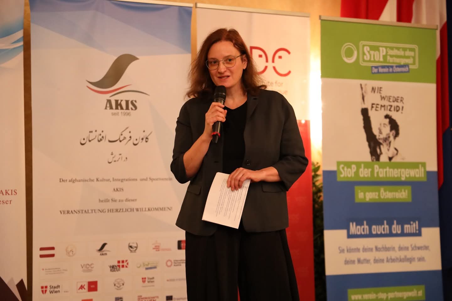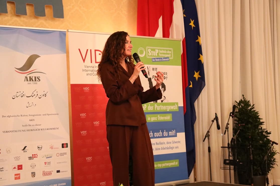 Sybille Straubinger, Direktorin des VIDC und Vera Glassnervon der Arbeiterkammer Wien bekräftigten als Kooperationspartner von AKIS ihr Kommittent im Kampf gegen die systematische Unterdrückung von Frauen und Mädchen in Afghanistan und für eine gelingende Integration in die österreichische Gesellschaft. Straubinger betonte, dass angesichts der vielen globalen Krisen die Gefahr bestehe, dass die anhaltende Situation in Afghanistan in Vergessenheit gerate. Während die Welt oft nur die aktuelle Krise im Blick habe, sei Afghanistan für die Menschen vor Ort, besonders für Frauen, eine katastrophale Realität. Um dies nicht aus dem Fokus zu verlieren, habe das VIDC gemeinsam mit anderen Initiativen einen Brief an alle 183 Abgeordneten des österreichischen Parlaments verfasst, mit der Forderung, Gender-Apartheid als Verbrechen gegen die Menschlichkeit anzuerkennen und international rechtlich zu verankern.