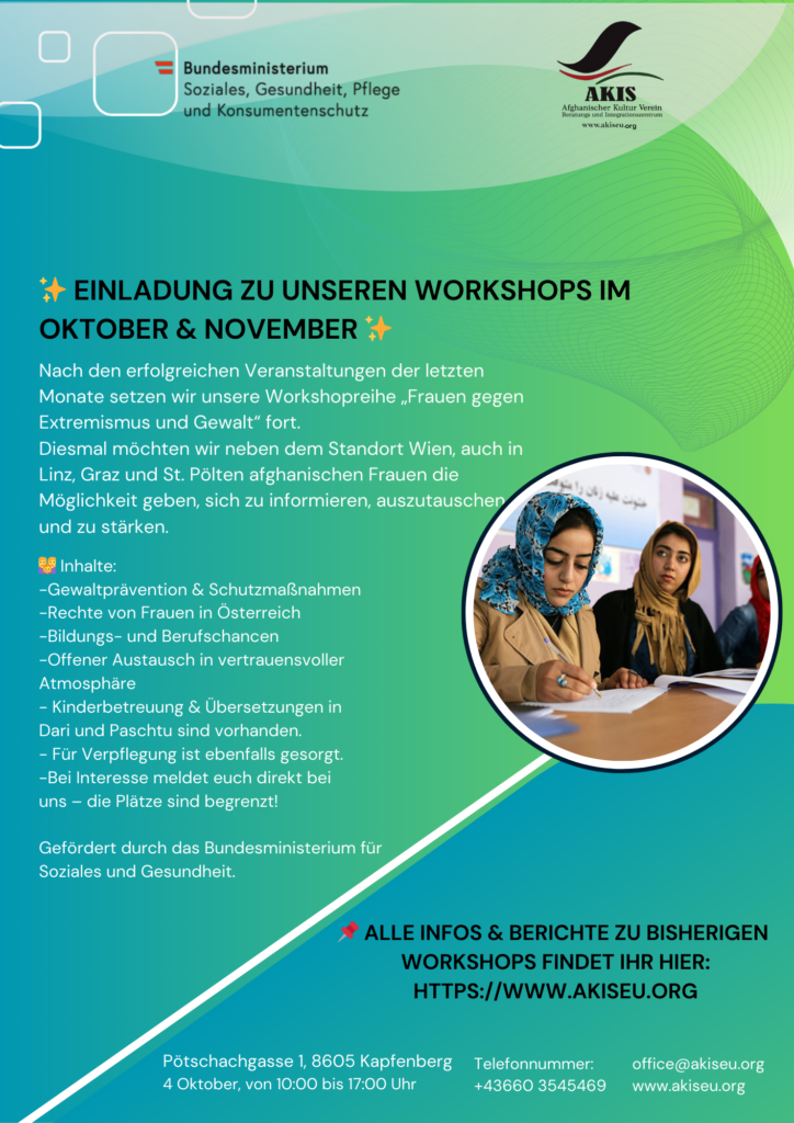 Diesmal möchten wir neben dem Standort Wien, auch in Linz, Graz und St. Pölten afghanischen Frauen die Möglichkeit geben, sich zu informieren, auszutauschen und zu stärken.