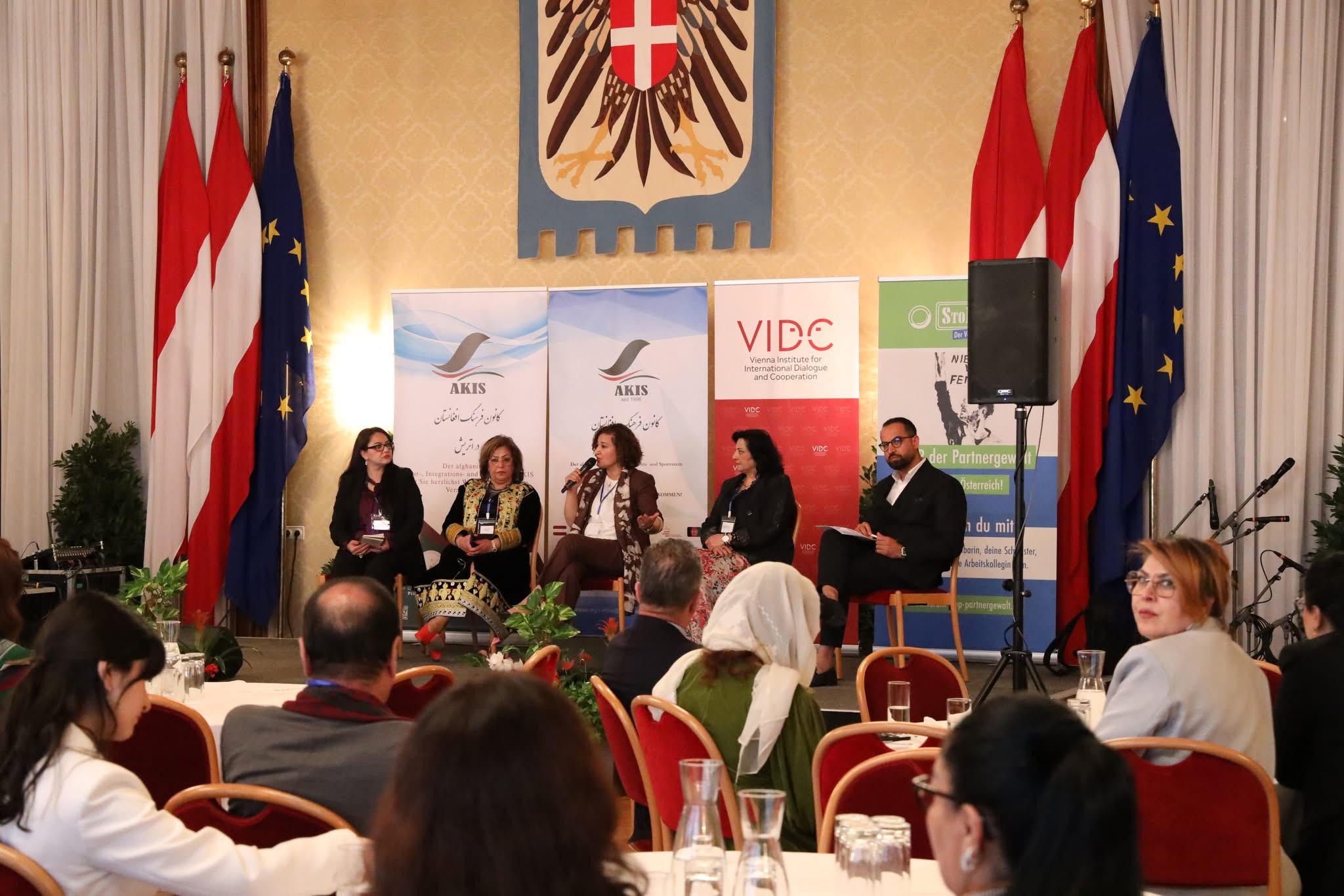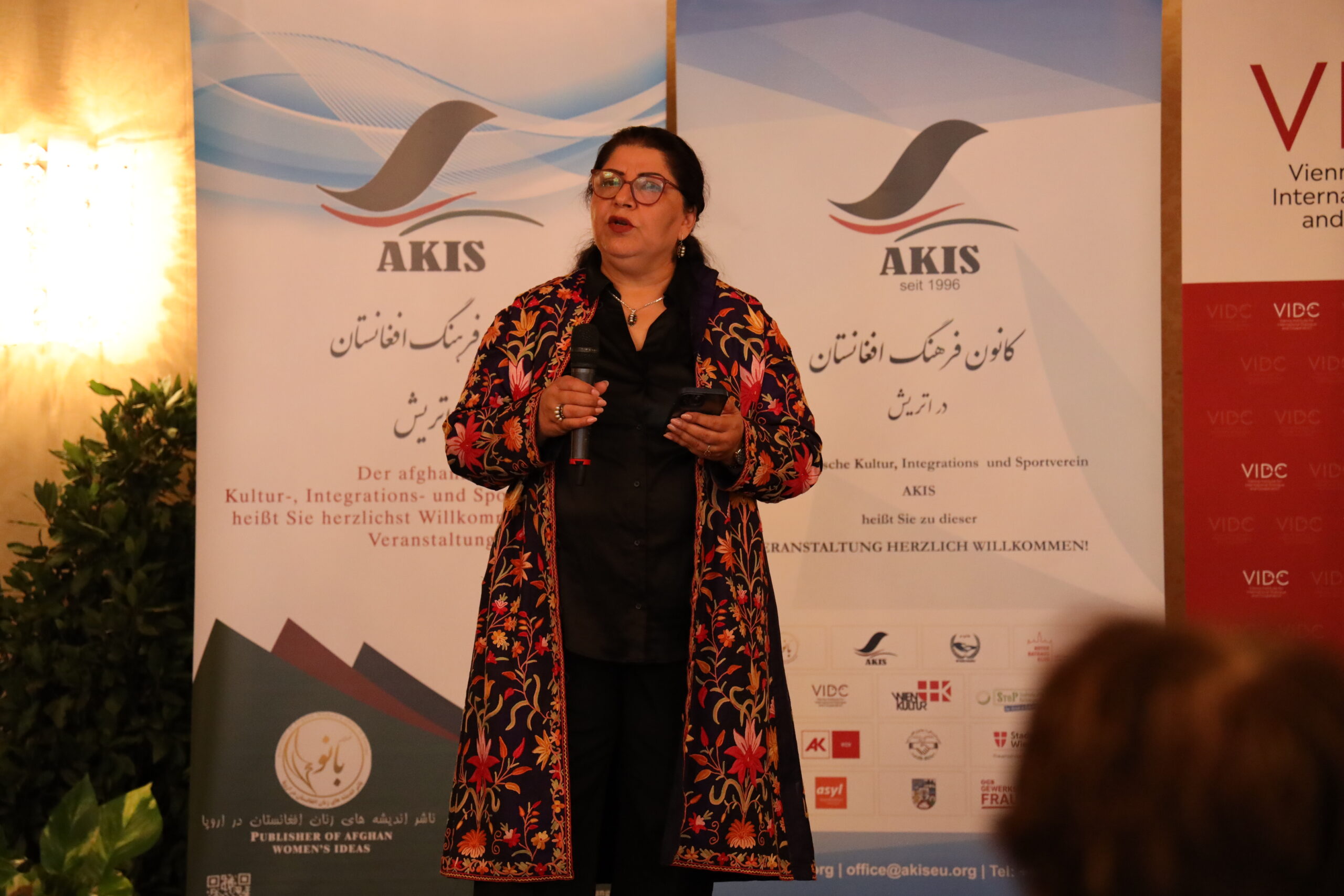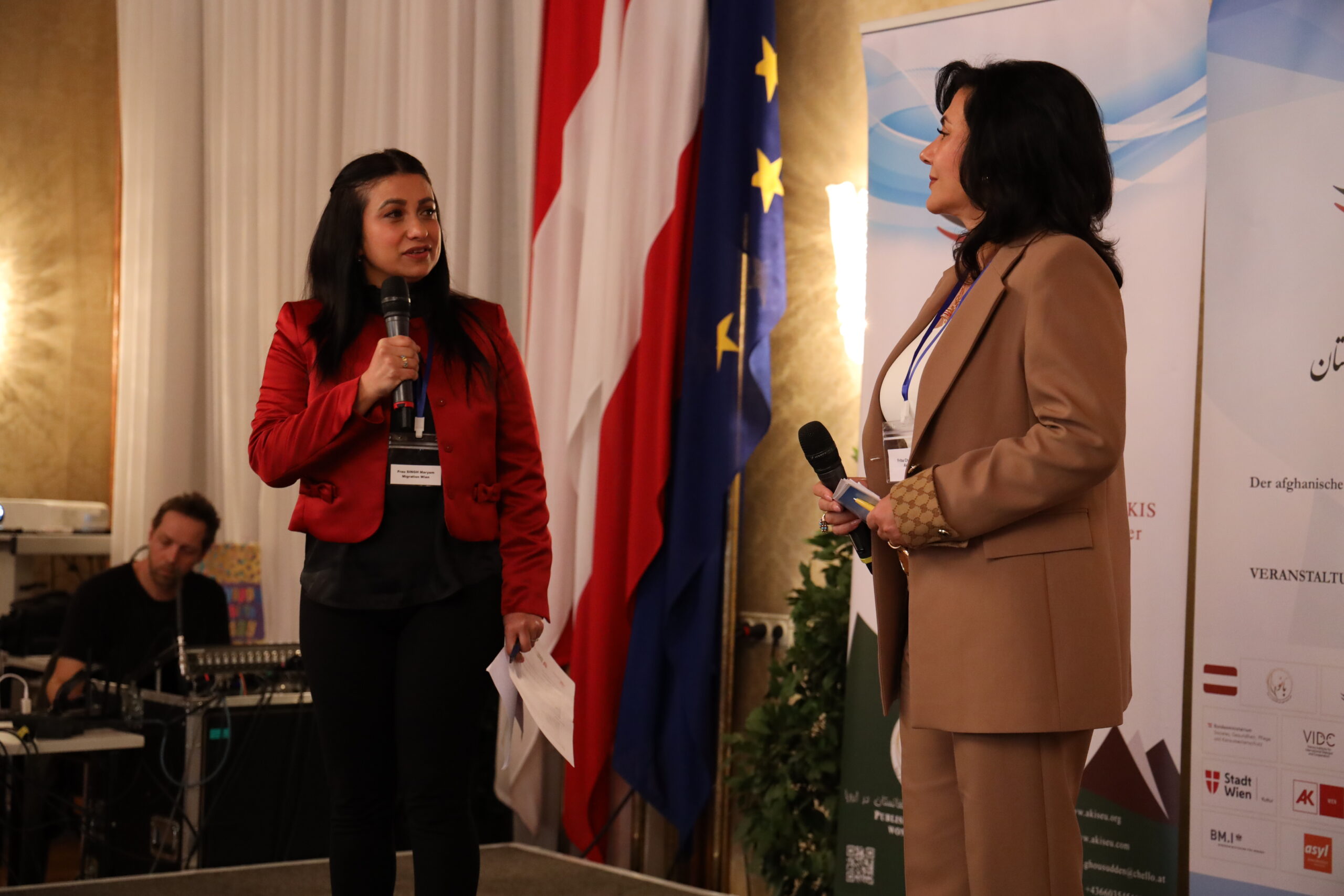 The afternoon session was opened by City Councilor Alexandra Rezaei, AKIS Chairman Ghousuddin Mir, former Deputy Minister at the Ministry of Women’s Affairs in Afghanistan Palwasha Kakar, migration researcher Judith Kohlenberger, Wali Shapour from the Association of Afghan Associations in the Netherlands, as well as Latif Estafli from AKIS and Friba Sadeq from Banu Magazine. The session was moderated by Maryam Singh from the Counseling Center for Migrants in Vienna and Friba Charkhi from AKIS.